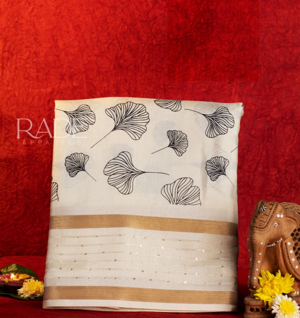 This soft white cotton saree offers a luxurious, and comfortable drape that flatters any form. Delicate leaf prints add a touch of nature’s elegance. Embellished with shimmering gold zari border, and subtle sequins sprinkled across the saree introduces a hint of grandeur. This saree is perfect for a variety of occasions, from formal gatherings to festive celebrations. The soft cotton makes it ideal for warmer weather.