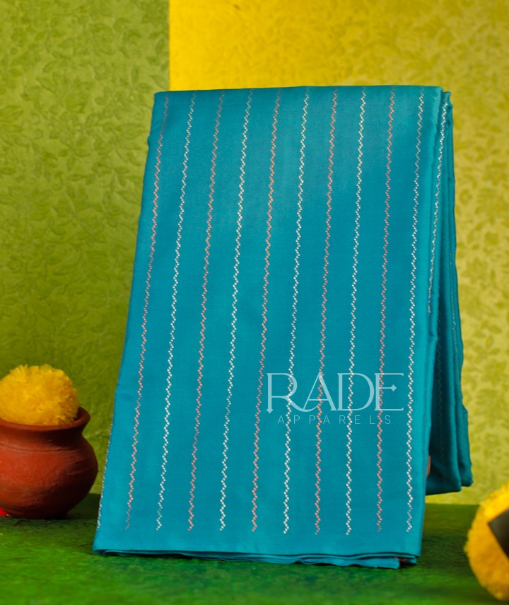 in a beautiful shade of blue. The saree features two-line pattern in contrasting metallic threads of copper and silver. The lack of border and zari creates a perfect showcase of the delicate sheen of the silk. This saree would be ideal for both formal and semi-formal occasions, where you want to make a statement with your elegance and sophistication.