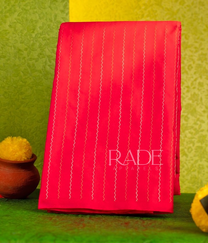 The pink soft silk saree gives a luxurious feel, its sheen adding a touch of sophistication.The two-line pattern eith silver and copper weave stands out from the lack of border and zari, creating a clean and minimalist aesthetic. A perfect choice to bring out understated elegance and individuality. A quintessetial staple for your wardrobe, ideal for special occasions like wedding, and festivals.