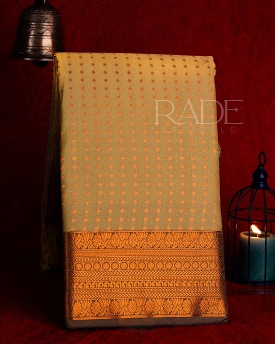 The yellow cream soft silk saree from the Kosigam Bridal Collection, crafted from luxurious silk, features a pristine hue and is beautifully complemented by a gold zari border and delicate dotted zari design. This saree is perfect for your special day and embodies sophistication and timeless tradition, making it an unforgettable bridal ensemble.